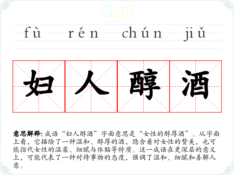 成语“妇人醇酒”字面意思是“女性的醇厚酒”。从字面上看,它描绘了一种温和、醇厚的酒,隐含着对女性的赞美,也可能指代女性的温柔、细腻与体贴等特质。这一成语在更深层的意义上,可能代表了一种对待事物的态度,强调了温和、细腻和善解人意。