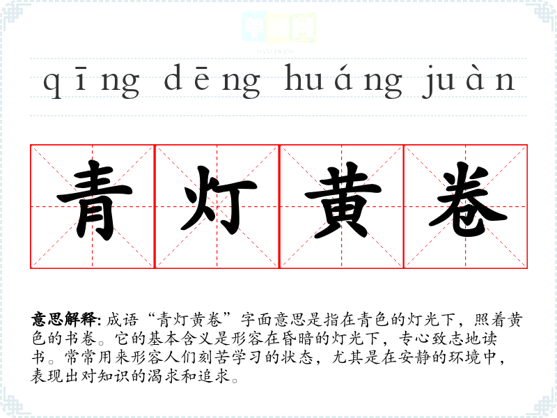 成语“青灯黄卷”字面意思是指在青色的灯光下,照着黄色的书卷。它的基本含义是形容在昏暗的灯光下,专心致志地读书。常常用来形容人们刻苦学*的状态,尤其是在安静的环境中,表现出对知识的渴求和追求。