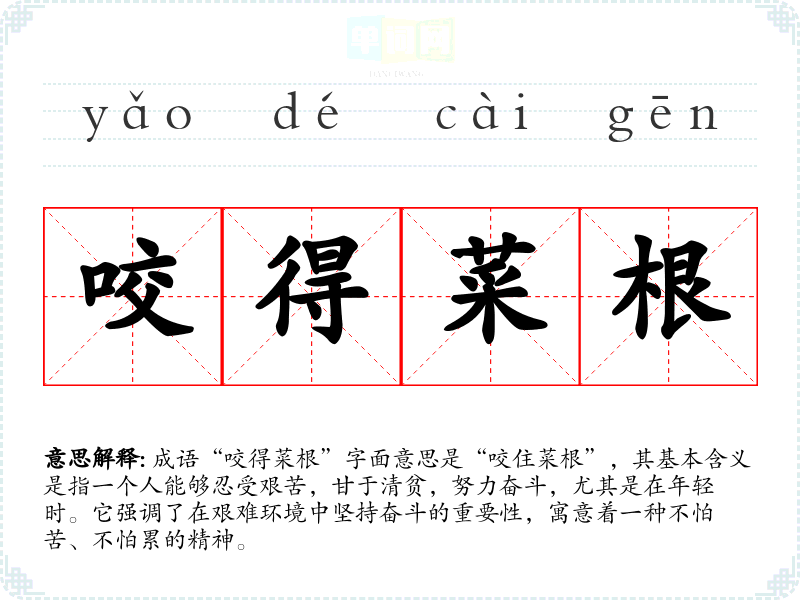 成语“咬得菜根”字面意思是“咬住菜根”,其基本含义是指一个人能够忍受艰苦,甘于清贫,努力奋斗,尤其是在年轻时。它强调了在艰难环境中坚持奋斗的重要性,寓意着一种不怕苦、不怕累的精神。