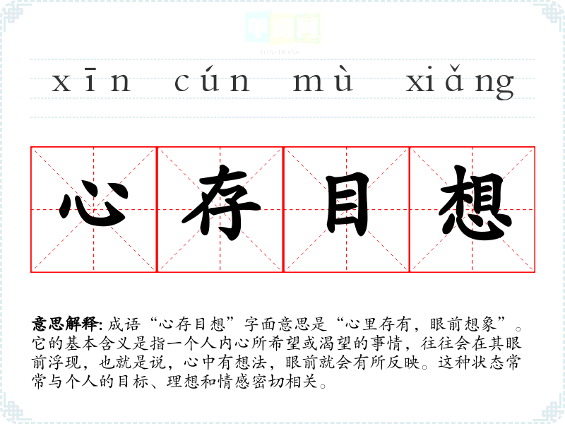 成语“心存目想”字面意思是“心里存有,眼前想象”。它的基本含义是指一个人内心所希望或渴望的事情,往往会在其眼前浮现,也就是说,心中有想法,眼前就会有所反映。这种状态常常与个人的目标、理想和情感密切相关。