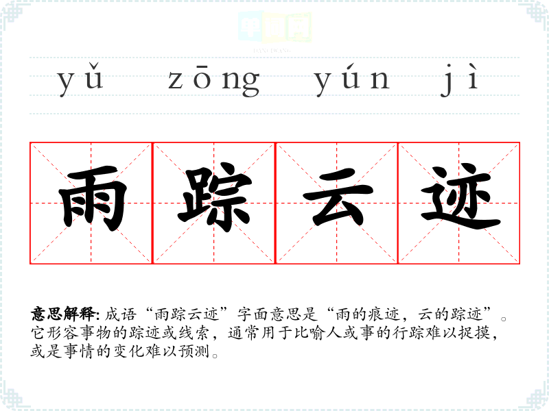 成语“雨踪云迹”字面意思是“雨的痕迹,云的踪迹”。它形容事物的踪迹或线索,通常用于比喻人或事的行踪难以捉摸,或是事情的变化难以预测。