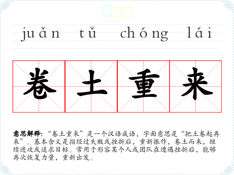 “卷土重来”是一个汉语成语,字面意思是“把土卷起再来”。基本含义是指经过失败或挫折后,重新振作,卷土而来,继续进攻或追求目标。常用于形容某个人或团队在遭遇挫折后,能够再次恢复力量,重新出发。