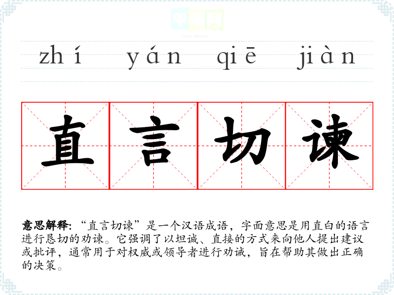 “直言切谏”是一个汉语成语,字面意思是用直白的语言进行恳切的劝谏。它强调了以坦诚、直接的方式来向他人提出建议或批评,通常用于对权威或领导者进行劝诫,旨在帮助其做出正确的决策。