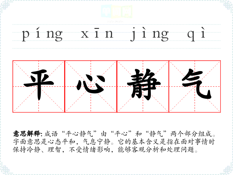成语“平心静气”由“平心”和“静气”两个部分组成。字面意思是心态平和,气息宁静。它的基本含义是指在面对事情时保持冷静、理智,不受情绪影响,能够客观分析和处理问题。