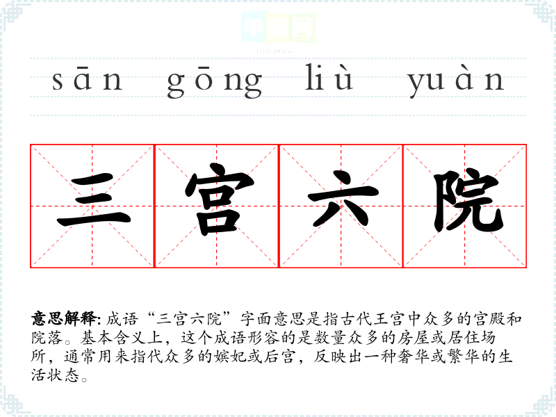 成语“三宫六院”字面意思是指古代王宫中众多的宫殿和院落。基本含义上,这个成语形容的是数量众多的房屋或居住场所,通常用来指代众多的嫔妃或后宫,反映出一种奢华或繁华的生活状态。