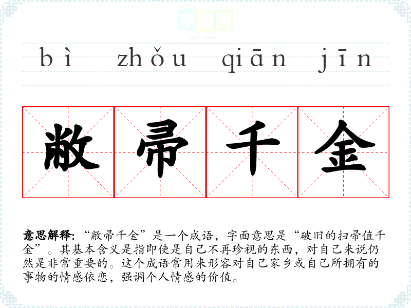 “敝帚千金”是一个成语,字面意思是“破旧的扫帚值千金”。其基本含义是指即使是自己不再珍视的东西,对自己来说仍然是非常重要的。这个成语常用来形容对自己家乡或自己所拥有的事物的情感依恋,强调个人情感的价值。