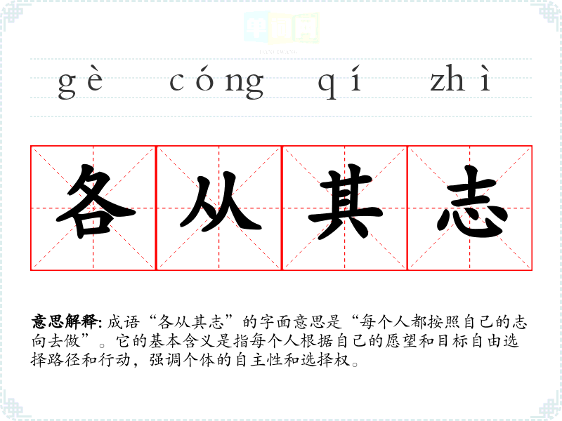 成语“各从其志”的字面意思是“每个人都按照自己的志向去做”。它的基本含义是指每个人根据自己的愿望和目标自由选择路径和行动,强调个体的自主性和选择权。