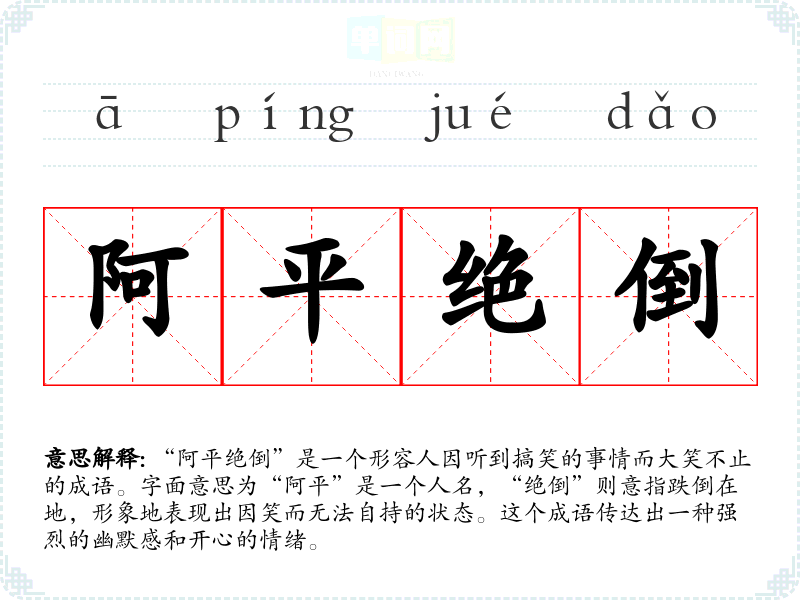 “阿平绝倒”是一个形容人因听到搞笑的事情而大笑不止的成语。字面意思为“阿平”是一个人名,“绝倒”则意指跌倒在地,形象地表现出因笑而无法自持的状态。这个成语传达出一种强烈的幽默感和开心的情绪。