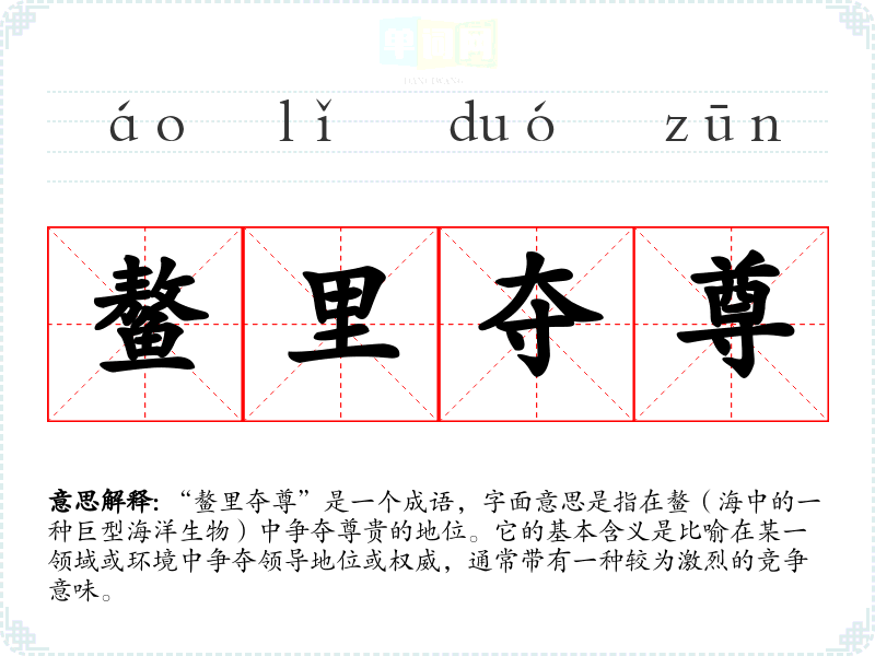 “鳌里夺尊”出自《庄子》,其中提到了一种对比,强调在庞大或复杂的环境中争夺地位的艰难与不易。鳌是**古代传说中的一种海怪,象征着力量与权威,故而“鳌里夺尊”有了争夺权威的引申意义。