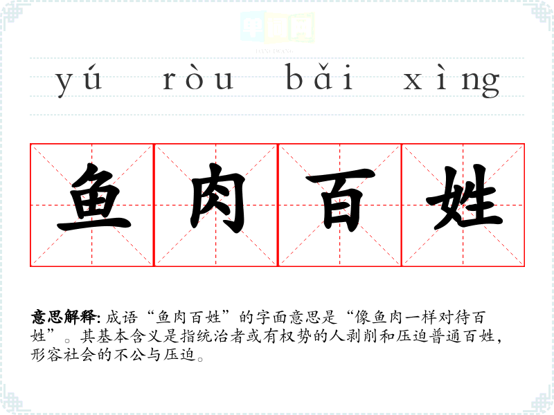 成语“鱼肉百姓”的字面意思是“像鱼肉一样对待百姓”。其基本含义是指统治者或有权势的人剥削和压迫普通百姓,形容社会的不公与压迫。