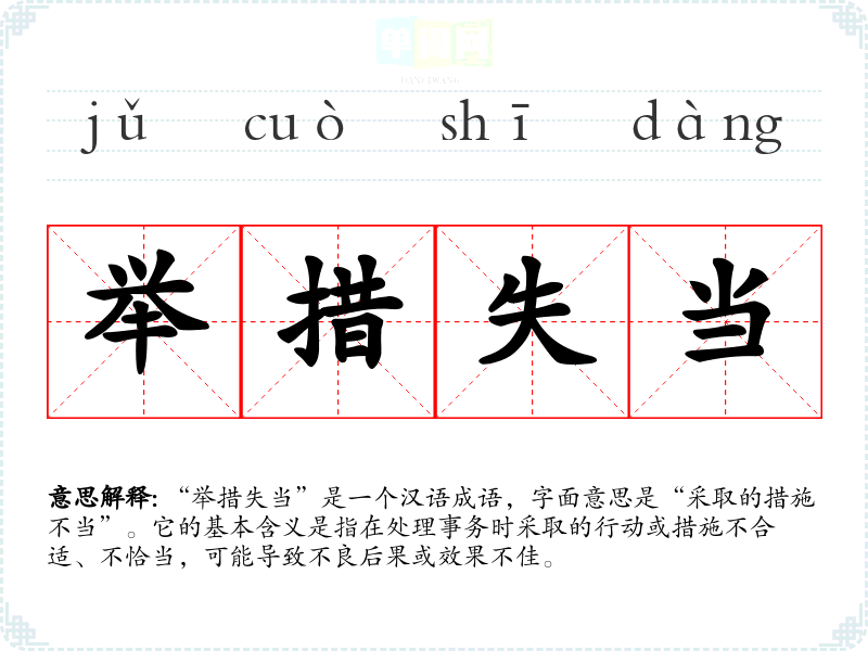 “举措失当”是一个汉语成语,字面意思是“采取的措施不当”。它的基本含义是指在处理事务时采取的行动或措施不合适、不恰当,可能导致不良后果或效果不佳。