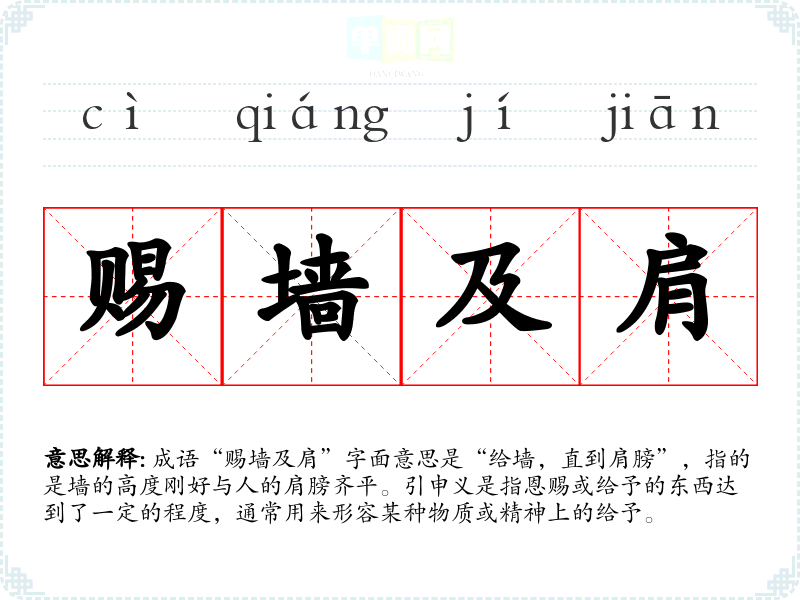 成语“赐墙及肩”字面意思是“给墙,直到肩膀”,指的是墙的高度刚好与人的肩膀齐平。引申义是指恩赐或给予的东西达到了一定的程度,通常用来形容某种物质或精神上的给予。