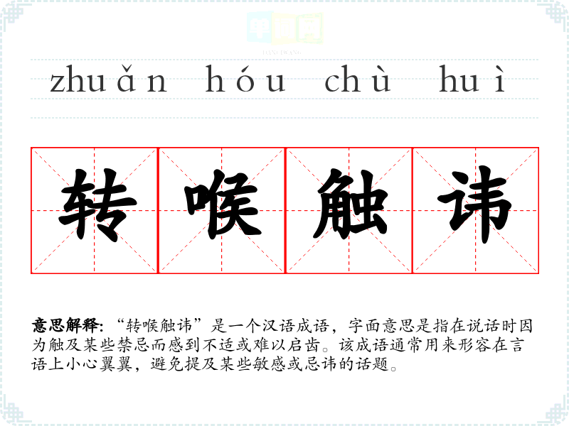 | 转喉触讳 | 指一说话或一写文章就触犯忌讳。 |
