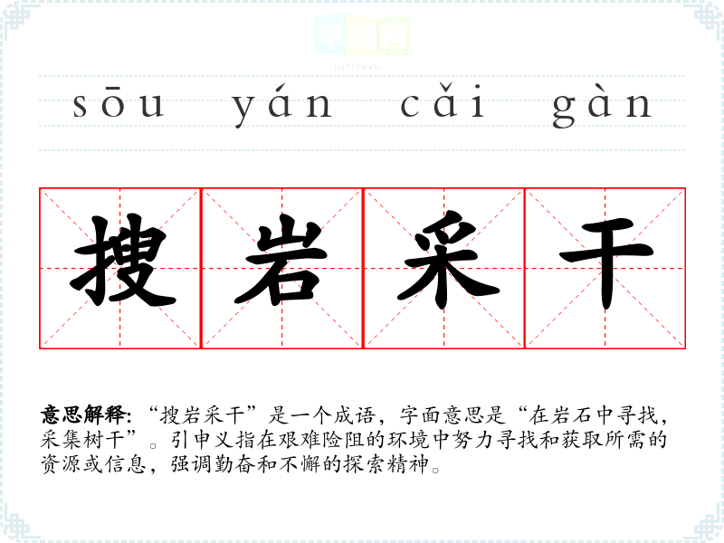 “搜岩采干”是一个成语,字面意思是“在岩石中寻找,采集树干”。引申义指在艰难险阻的环境中努力寻找和获取所需的资源或信息,强调勤奋和不懈的探索精神。