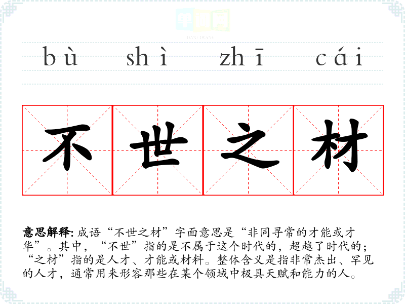 成语“不世之材”字面意思是“非同寻常的才能或才华”。其中,“不世”指的是不属于这个时代的,超越了时代的;“之材”指的是人才、才能或材料。整体含义是指非常杰出、罕见的人才,通常用来形容那些在某个领域中极具天赋和能力的人。