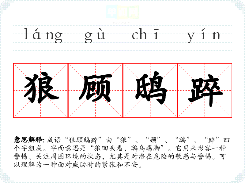 成语“狼顾鸱踤”由“狼”、“顾”、“鸱”、“踤”四个字组成。字面意思是“狼回头看,鸱鸟踢脚”。它用来形容一种警惕、关注周围环境的状态,尤其是对潜在危险的敏感与警惕。可以理解为一种面对威胁时的紧张和不安。
