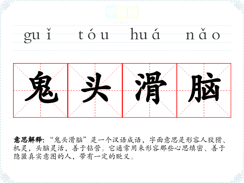 “鬼头滑脑”是一个汉语成语,字面意思是形容人狡猾、机灵,头脑灵活,善于钻营。它通常用来形容那些心思缜密、善于隐匿真实意图的人,带有一定的贬义。