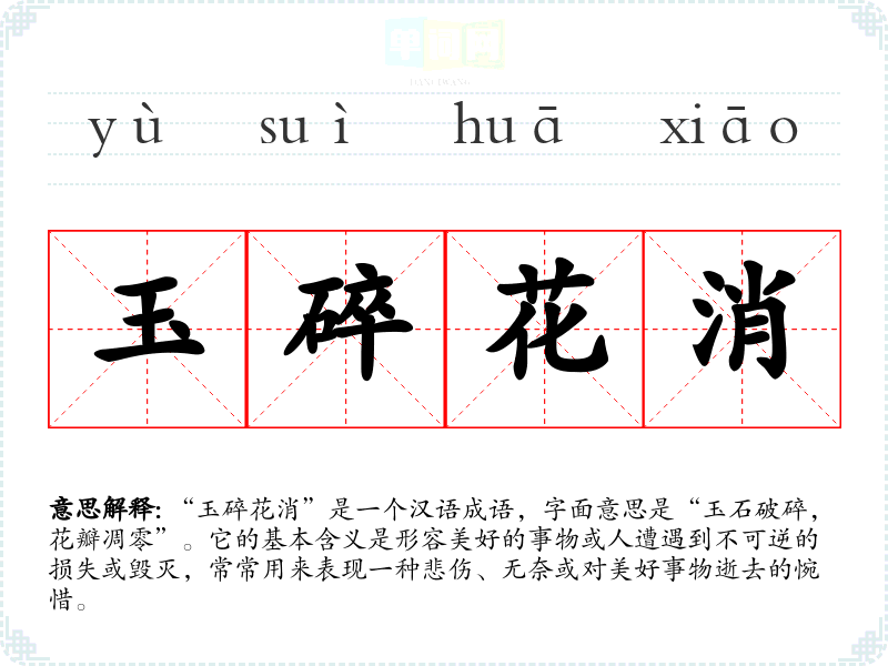 “玉碎花消”是一个汉语成语,字面意思是“玉石破碎,花瓣凋零”。它的基本含义是形容美好的事物或人遭遇到不可逆的损失或毁灭,常常用来表现一种悲伤、无奈或对美好事物逝去的惋惜。