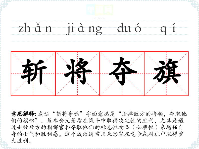 成语“斩将夺旗”字面意思是“杀掉敌方的将领,夺取他们的旗帜”。基本含义是指在战斗中取得决定性的胜利,尤其是通过击败敌方的指挥官和夺取他们的标志性物品(如旗帜)来增强自身的士气和胜利感。这个成语通常用来形容在竞争或对抗中取得重大胜利。