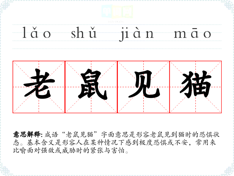 - 反义成语:如“泰然自若”,形容在压力下仍能保持冷静,正好与“老鼠见猫”形成鲜明对比。