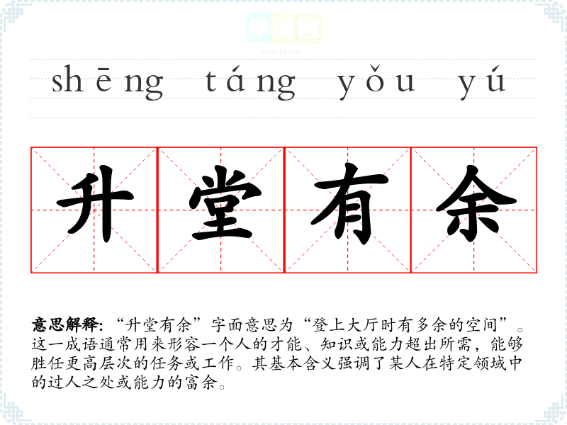“升堂有余”字面意思为“登上大厅时有多余的空间”。这一成语通常用来形容一个人的才能、知识或能力超出所需,能够胜任更高层次的任务或工作。其基本含义强调了某人在特定领域中的过人之处或能力的富余。