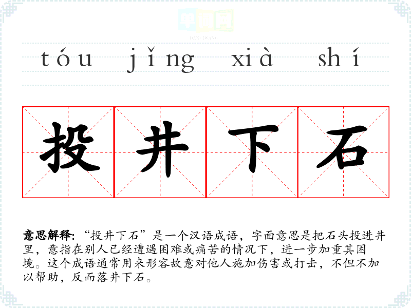 “投井下石”是一个汉语成语,字面意思是把石头投进井里,意指在别人已经遭遇困难或痛苦的情况下,进一步加重其困境。这个成语通常用来形容故意对他人施加伤害或打击,不但不加以帮助,反而落井下石。