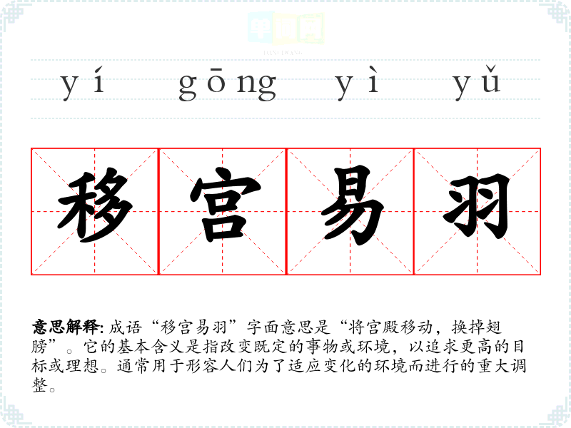 成语“移宫易羽”字面意思是“将宫殿移动,换掉翅膀”。它的基本含义是指改变既定的事物或环境,以追求更高的目标或理想。通常用于形容人们为了适应变化的环境而进行的重大调整。