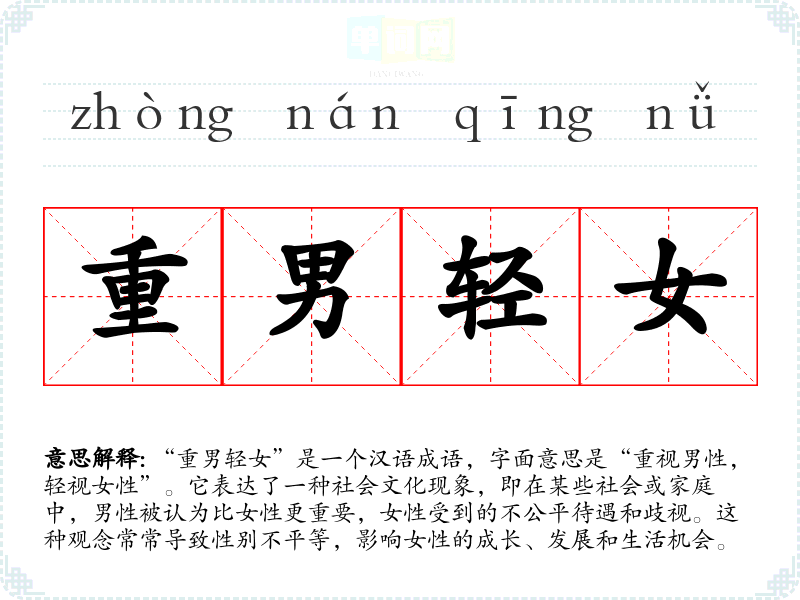 “重男轻女”是一个汉语成语,字面意思是“重视男性,轻视女性”。它表达了一种社会文化现象,即在某些社会或家庭中,男性被认为比女性更重要,女性受到的不公平待遇和歧视。这种观念常常导致性别不平等,影响女性的成长、发展和生活机会。