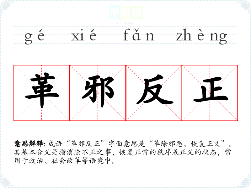 - 日常对话:可以在朋友之间讨论社会问题时使用,比如“我们应该革邪反正,为社会的进步贡献力量”。