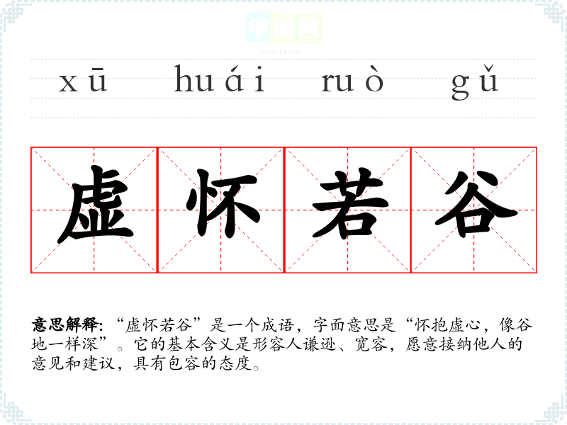“虚怀若谷”是一个成语,字面意思是“怀抱虚心,像谷地一样深”。它的基本含义是形容人谦逊、宽容,愿意接纳他人的意见和建议,具有包容的态度。