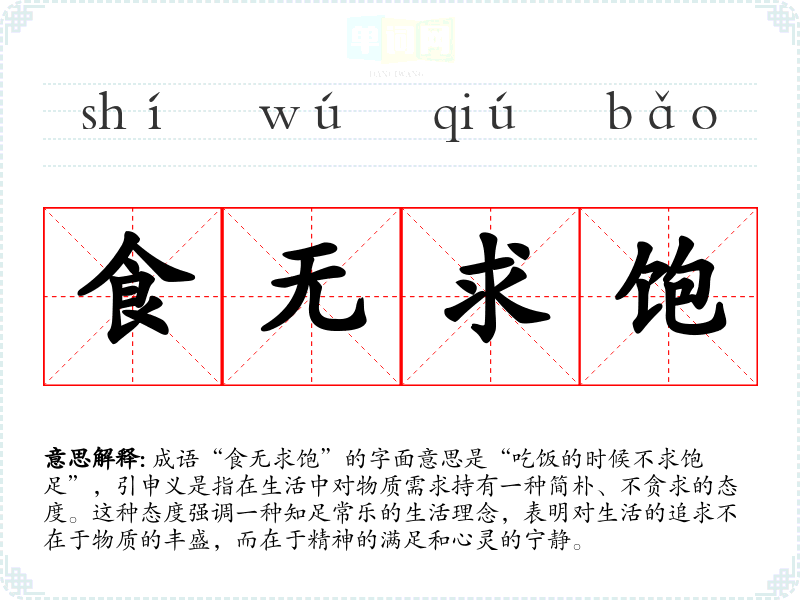 “食无求饱”源于古代的哲学思想,尤其是道家和儒家的理念。它反映了一种对物质欲望的节制以及对精神追求的重视。虽然具体的历史典故可能不详,但可以理解为在对待饮食与生活方式上,古人提倡一种清淡、简朴的生活,以避免过度的物质追求。