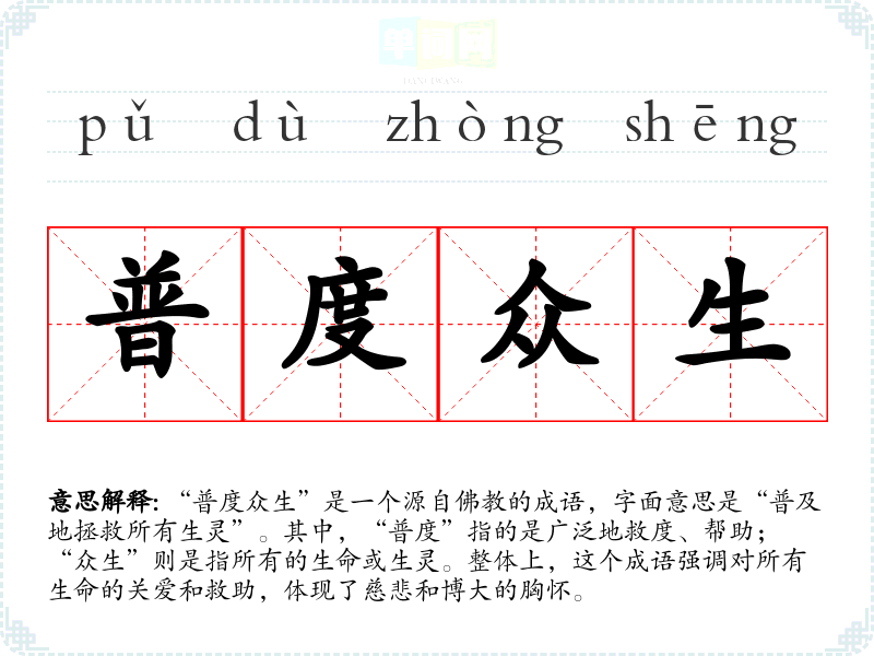 - 同义成语:慈悲为怀、救死扶伤、惠及万民。这些成语都强调关怀和帮助他人的精神,但“普度众生”更加强调广泛性和无私性。