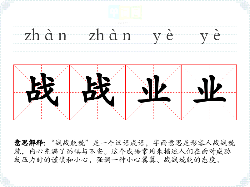 | 战战栗栗 | 战战:戒惧的样子;栗栗:哆嗦,发抖。因戒惧而小心谨慎的样子。 |