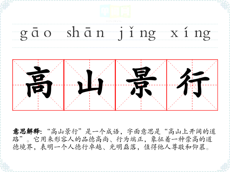 “高山景行”是一个成语,字面意思是“高山上开阔的道路”。它用来形容人的品德高尚、行为端正,象征着一种崇高的道德境界,表明一个人德行卓越、光明磊落,值得他人尊敬和仰慕。