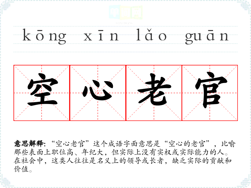 “空心老官”这个成语字面意思是“空心的老官”,比喻那些表面上职位高、年纪大,但实际上没有实权或实际能力的人。在社会中,这类人往往是名义上的领导或**,缺乏实际的贡献和价值。