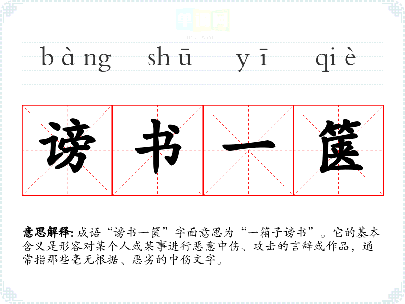 成语“谤书一箧”字面意思为“一箱子谤书”。它的基本含义是形容对某个人或某事进行恶意中伤、攻击的言辞或作品,通常指那些毫无根据、恶劣的中伤文字。