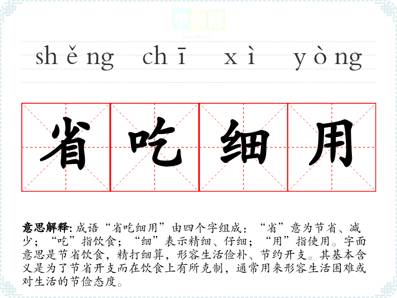 成语“省吃细用”由四个字组成:“省”意为节省、减少;“吃”指饮食;“细”表示精细、仔细;“用”指使用。字面意思是节省饮食,精打细算,形容生活俭朴、节约开支。其基本含义是为了节省开支而在饮食上有所克制,通常用来形容生活困难或对生活的节俭态度。
