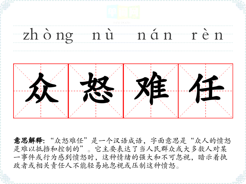 该成语来源于**古代的政治和社会生活,尤其是对于统治者如何应对民众情绪的关注。在古代,一旦民众对统治者的不满达到一定程度,可能会引发叛乱或重大社会动荡。因此,“众怒难任”反映了历史上对于民意和民众情绪的重视。