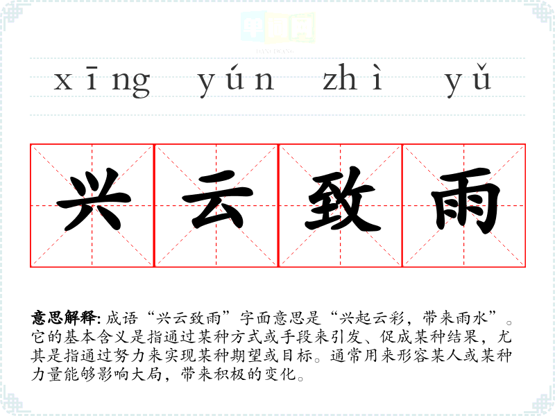 成语“兴云致雨”字面意思是“兴起云彩,带来雨水”。它的基本含义是指通过某种方式或手段来引发、促成某种结果,尤其是指通过努力来实现某种期望或目标。通常用来形容某人或某种力量能够影响大局,带来积极的变化。