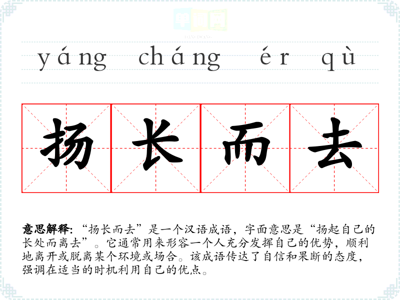 “扬长而去”是一个汉语成语,字面意思是“扬起自己的长处而离去”。它通常用来形容一个人充分发挥自己的优势,顺利地离开或脱离某个环境或场合。该成语传达了自信和果断的态度,强调在适当的时机利用自己的优点。