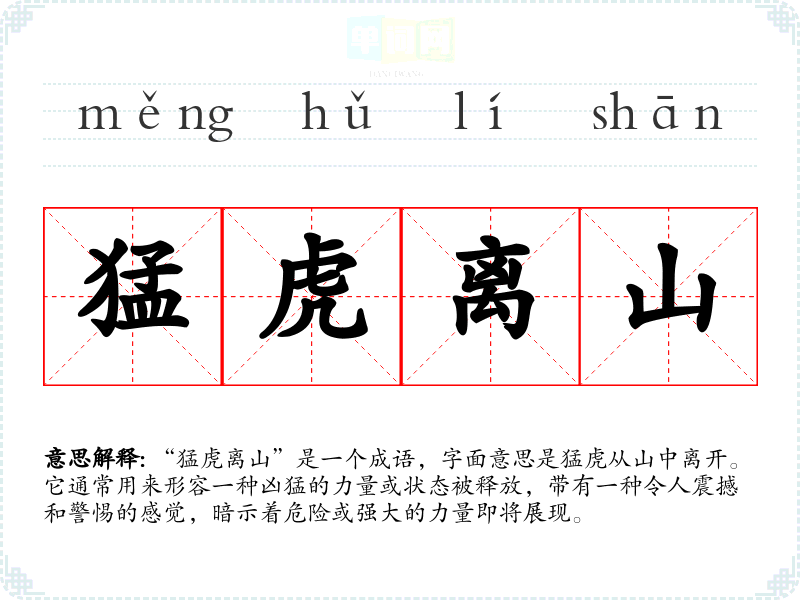 “猛虎离山”是一个成语,字面意思是猛虎从山中离开。它通常用来形容一种凶猛的力量或状态被释放,带有一种令人震撼和警惕的感觉,暗示着危险或强大的力量即将展现。