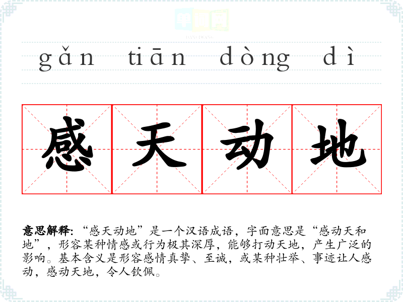 | 感天动地 | 使苍天和大地为之感动。形容诚意感人至深。亦比喻使无情天地受感动。形容冤屈极大。 |