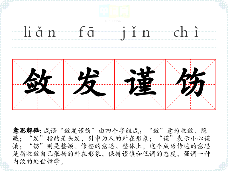 成语“敛发谨饬”由四个字组成:“敛”意为收敛、隐藏;“发”指的是头发,引申为人的外在形象;“谨”表示小心谨慎;“饬”则是整顿、修整的意思。整体上,这个成语传达的意思是指收敛自己张扬的外在形象,保持谨慎和低调的态度,强调一种内敛的处世哲学。
