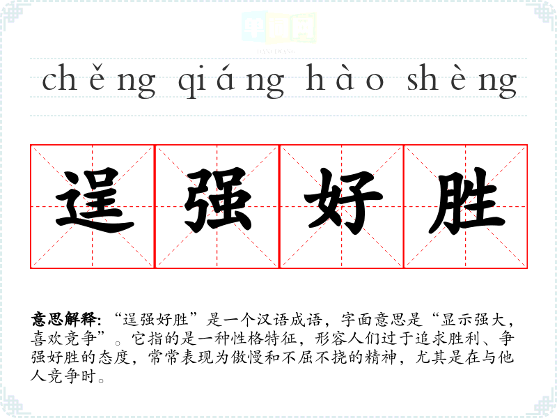 “逞强好胜”是一个汉语成语,字面意思是“显示强大,喜欢竞争”。它指的是一种性格特征,形容人们过于追求胜利、争强好胜的态度,常常表现为傲慢和不屈不挠的精神,尤其是在与他人竞争时。