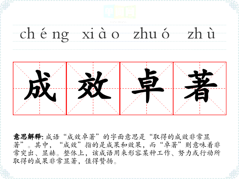 成语“成效卓著”的字面意思是“取得的成效非常显著”。其中,“成效”指的是成果和效果,而“卓著”则意味着非常突出、显赫。整体上,该成语用来形容某种工作、努力或行动所取得的成果非常显著,值得赞扬。