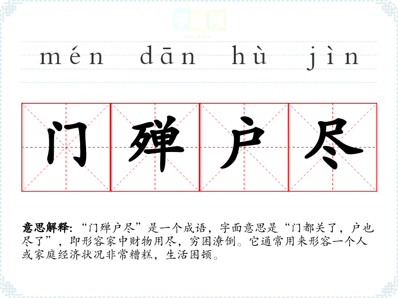 “门殚户尽”是一个成语,字面意思是“门都关了,户也尽了”,即形容家中财物用尽,穷困潦倒。它通常用来形容一个人或家庭经济状况非常糟糕,生活困顿。