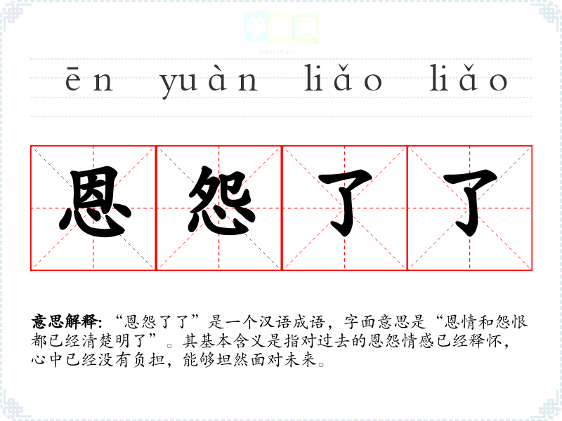 “恩怨了了”是一个汉语成语,字面意思是“恩情和怨恨都已经清楚明了”。其基本含义是指对过去的恩怨情感已经释怀,心中已经没有负担,能够坦然面对未来。