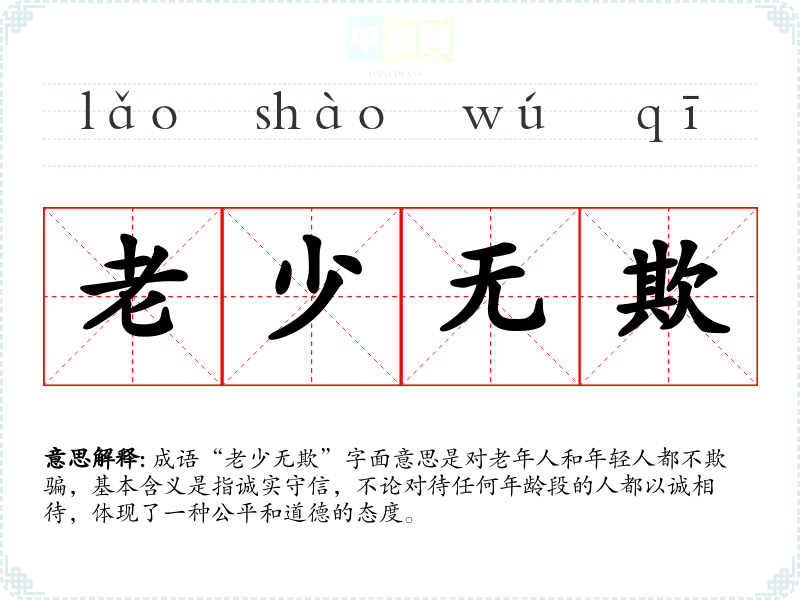 成语“老少无欺”字面意思是对老年人和年轻人都不欺骗,基本含义是指诚实守信,不论对待任何年龄段的人都以诚相待,体现了一种公平和道德的态度。