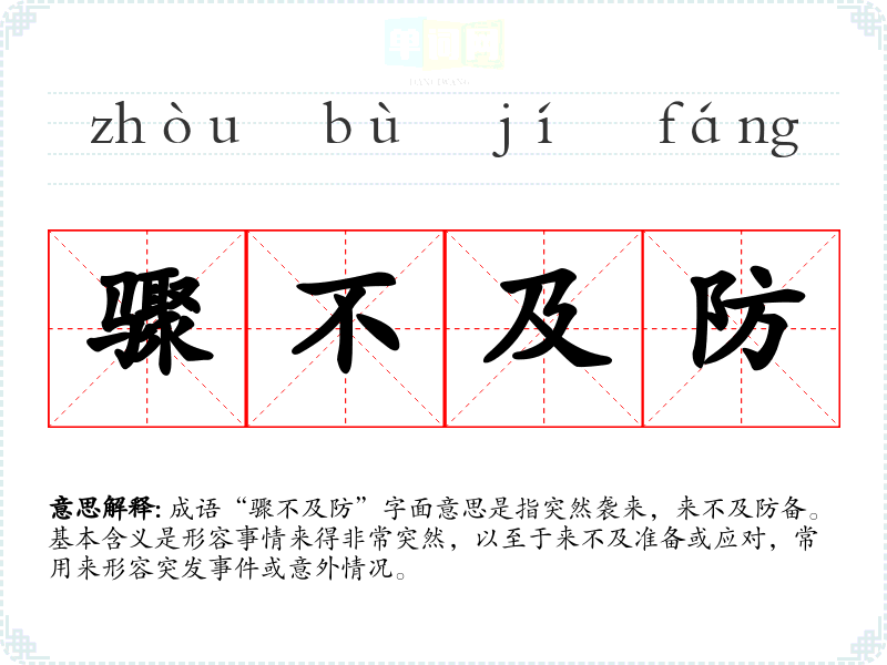 成语“骤不及防”字面意思是指突然袭来,来不及防备。基本含义是形容事情来得非常突然,以至于来不及准备或应对,常用来形容突发**或意外情况。