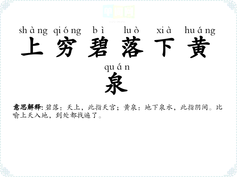 | 上穷碧落下黄泉 | 碧落:天上,此指天宫;黄泉:地下泉水,此指阴间。比喻上天入地,到处都找遍了。 |